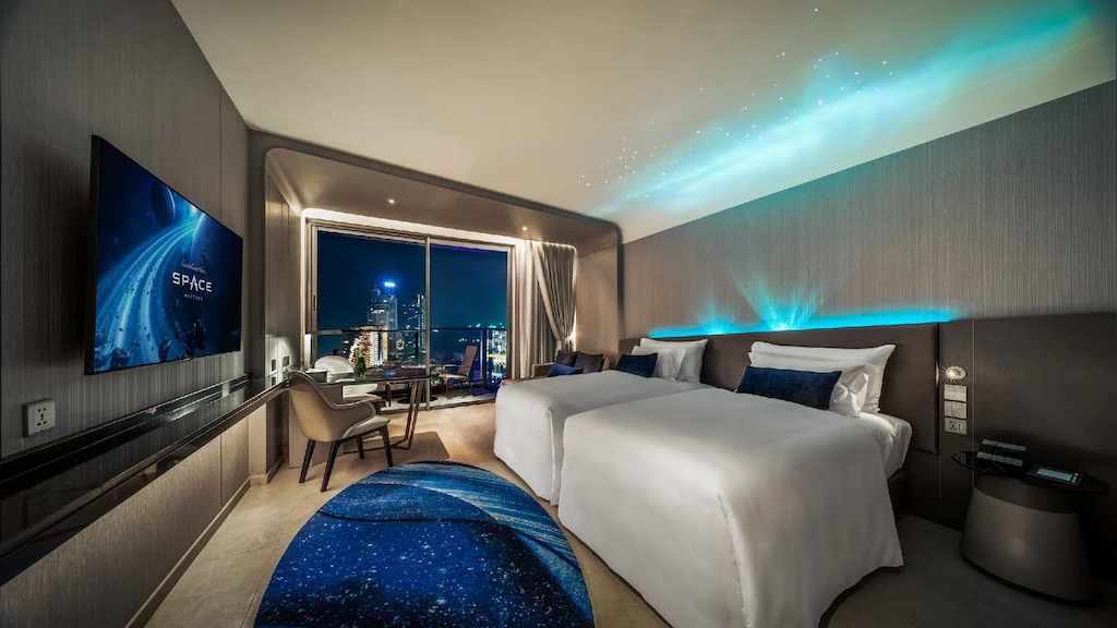 Grande Centre Point Space Pattaya is a five-star hotel located at the northern tip of Pattaya Bay, offering stunning views of both the city and the sea. The hotel stands out with its futuristic space-themed design and cutting-edge technology, creating a unique and modern atmosphere for guests.